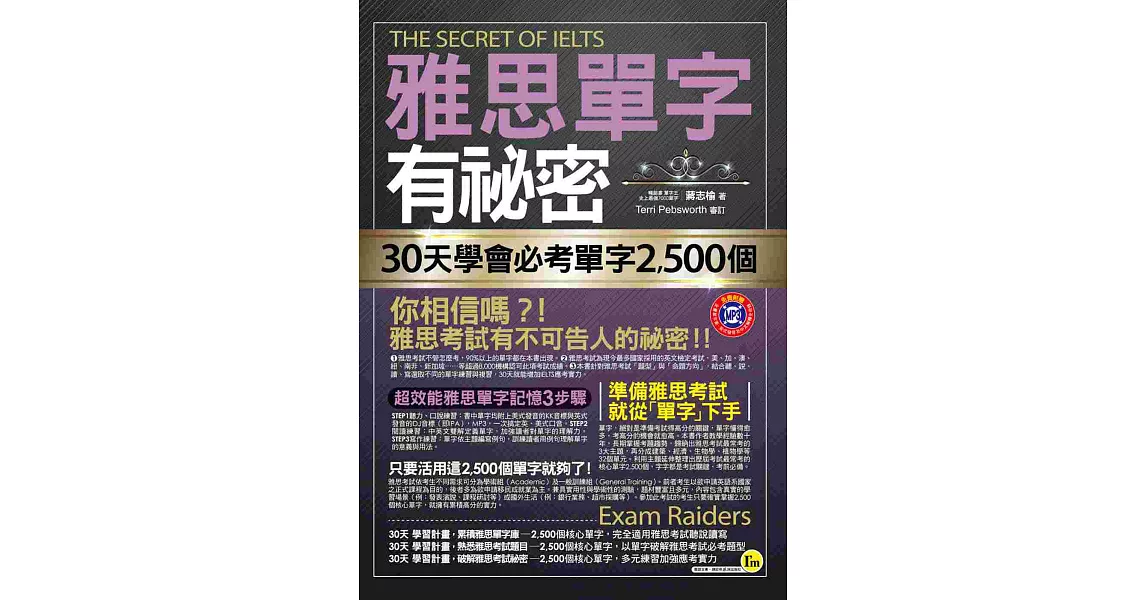 博客來-雅思單字有祕密:30天學會必考單字2,500個 (附1MP3+防水書套)訂購網址: https://www.books.com.tw/exep/assp.php/87926/products/0010650503?utm_source=87926&utm_medium=ap-books&utm_content=recommend&utm_campaign=ap-201906