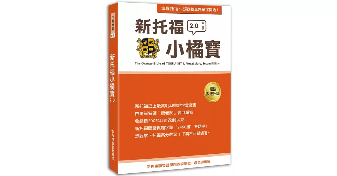 商品描述: 書名:新托福小橘寶,原文名稱:The Orange Bible of TOEFL iBT JJ Vocabulary, Second Edition,語言:繁體中文,ISBN:9789869378901,頁數:202,出版社:新視野國際,作者:康老師,出版日期:2016/12/28,類別:語言學習