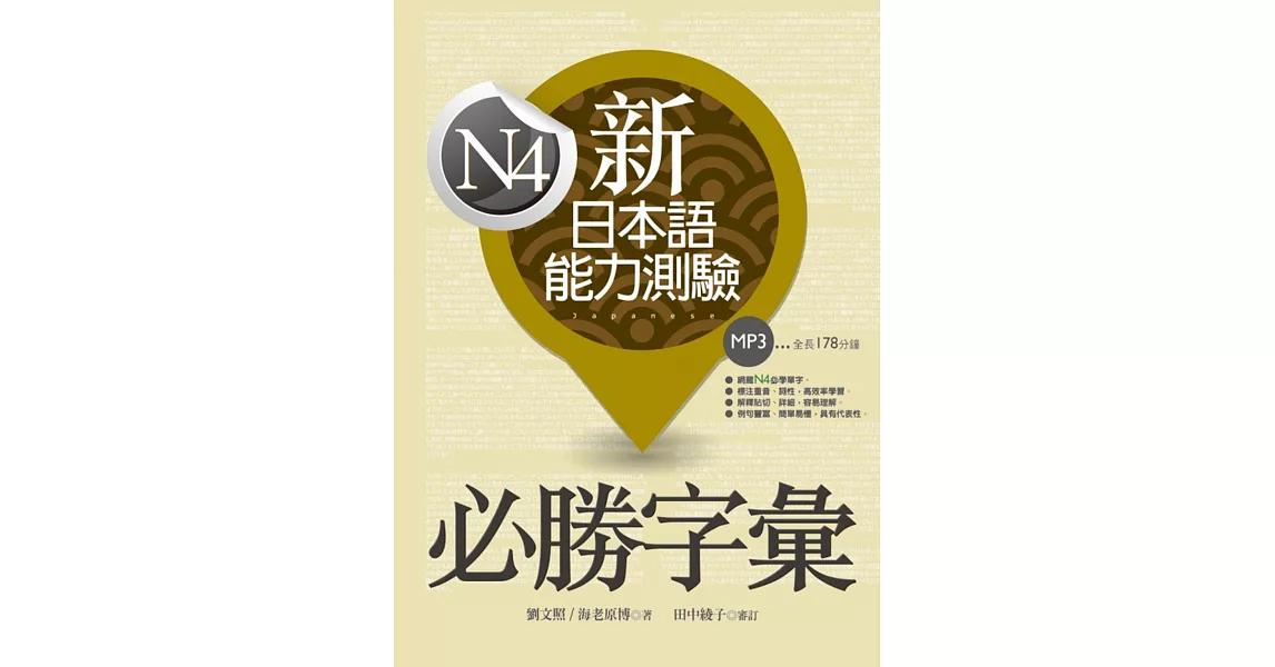 博客來-新日本語能力測驗N4必勝字彙(32K軟精裝+2MP3)訂購網址: https://www.books.com.tw/exep/assp.php/87926/products/0010691057?utm_source=87926&utm_medium=ap-books&utm_content=recommend&utm_campaign=ap-201906